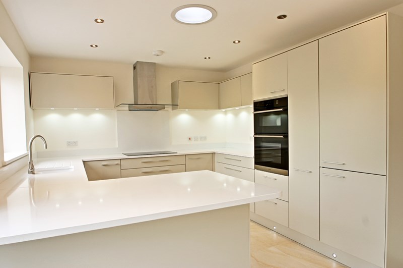 Range of matt stone slab fronted units with soft-close doors and composite granite work tops, island with breakfast bar, French doors to garden, integrated appliances: double oven, microwave, induction hob, glass &stainless steel cooker hood, fridge/freezer and dishwasher