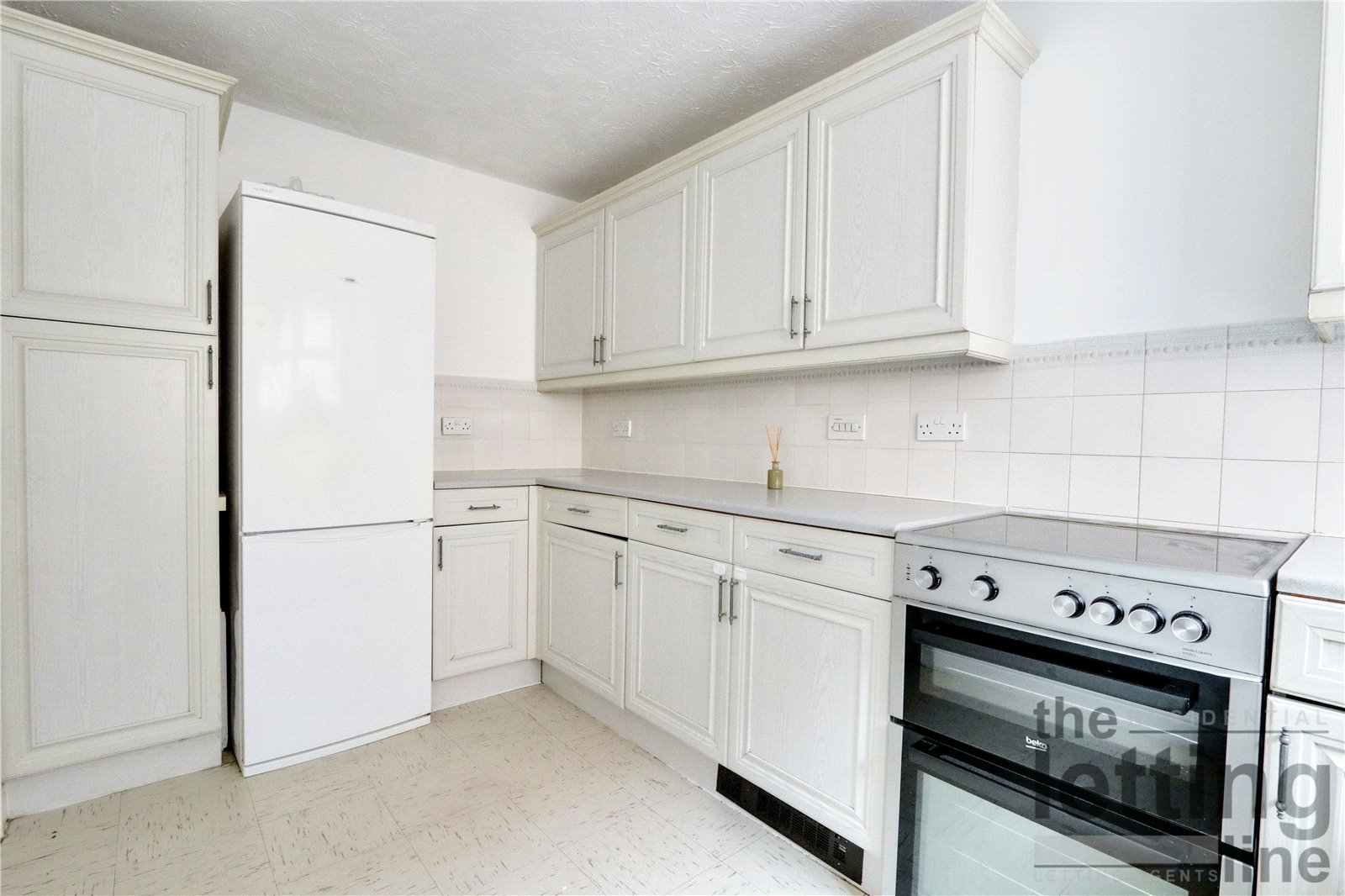 Free standing fridge/freezer, free standing electric oven with four ring hob, free standing washing machine.